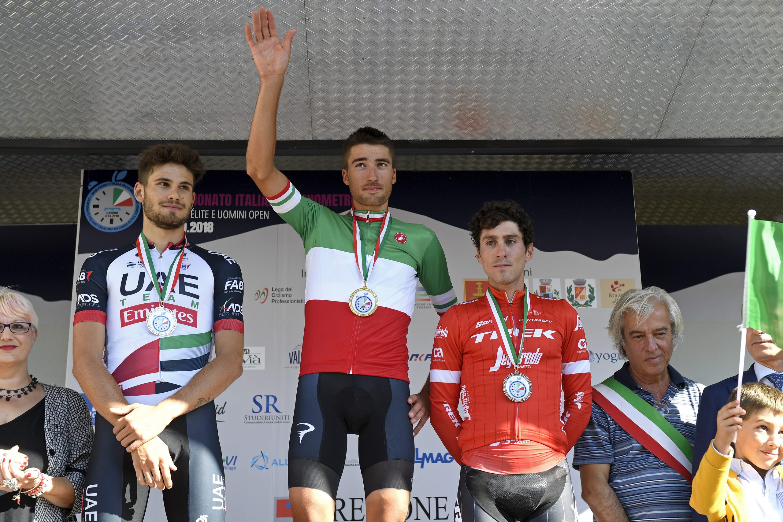 Gianni Moscon (Team Sky) ha conquistato la prova maschile, confermando la vittoria ottenuta l’anno scorso in un’altra edizione “piemontese” dei Campionati Italiani. Il 24enne trentino, da poco rientrato dai Mondiali dove ha gareggiato nella prova in linea, ha chiuso in 48’21″6 e battuto per pochi secondi Filippo Ganna (UAE Team Emirates, 48’24″0) e Fabio Felline (Trek-Segafredo, 49’19″2), entrambi piemontesi, rispettivamente classe 1996 di Verbania e classe 1990 di Torino. Nella foto in alto il podio finale (del fotografo Filippo Alfero).