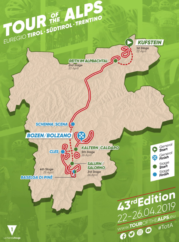 Ecco il programma del Tour of the Alps 2019: 711 km divisi su cinque tappe, con 10 Gran Premi della Montagna e complessivi 13.630 metri di dislivello.