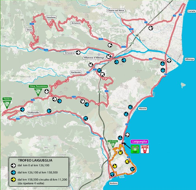 Dopo un primo passaggio in zona traguardo, a circa metà gara, si entrerà nel vivo con il Capo Mele e il Testico per poi entrare nel circuito conclusivo di 12,6 chilometri con le asperità di Capo Mele e Colla Micheri che sarà affrontato, ecco la novità, per quattro volte prima dell’arrivo. Dopo 203 chilometri di gara.