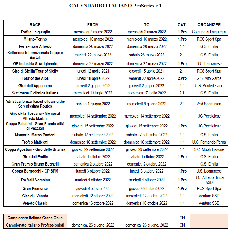 Da marzo fino a ottobre, una lunga cavalcata verso il titolo di campione d’Italia. In questa stagione ventitré prove comporranno la Ciclismo Cup 2022, ai nastri di partenza mercoledì 2 marzo con il 59° Trofeo Laigueglia che inaugurerà la nuova annata ciclistica sulle strade italiane. Il regolamento è stato ufficializzato, si ripartirà dal successo della UAE Emirates della scorsa stagione e la nuova edizione si disputerà, come sempre, sulla base di tutte le prove italiane di classe ProSeries e 1 incluse nello Europe Tour dell’Unione Ciclistica Internazionale.