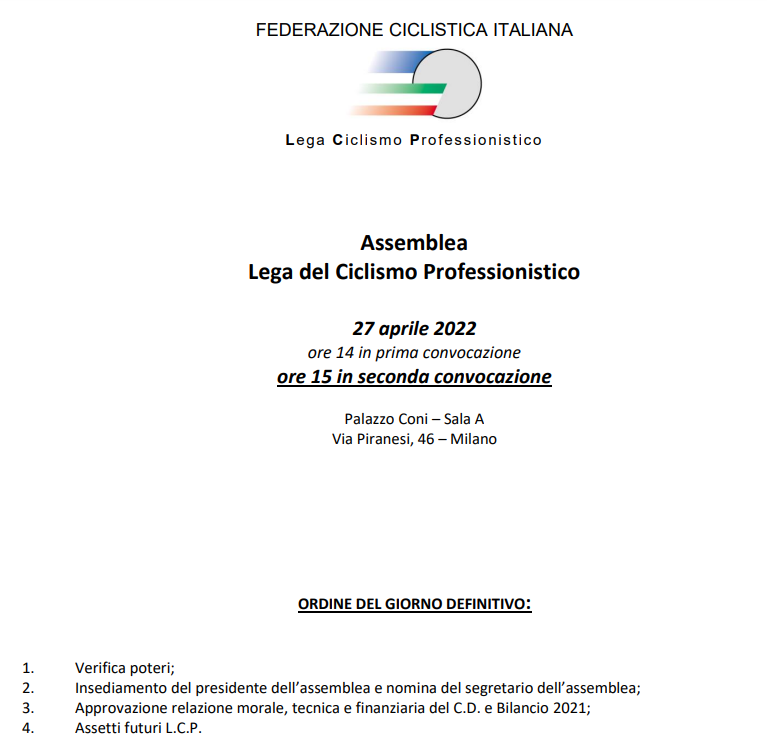 L’assemblea della Lega del Ciclismo Professionistico è convocata per mercoledì 27 aprile 2022. Si rende nota la convocazione integrale e l’ordine del giorno definitivo: