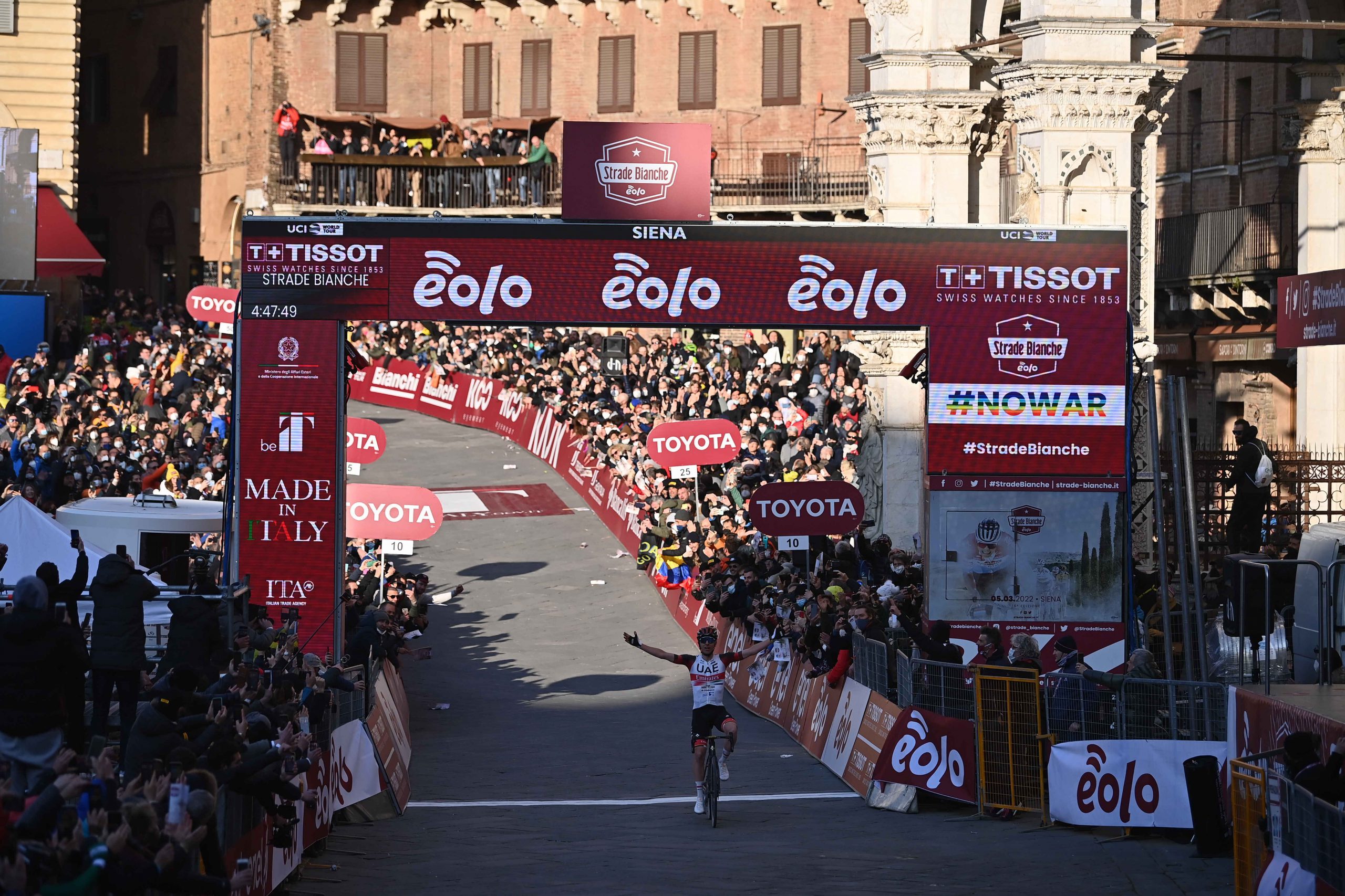 Tadej Pogacar, il fenomeno sloveno della UAE Team Emirates, ha vinto la 16ª edizione della Strade Bianche , da Siena (Fortezza Medicea) a Siena (Piazza del Campo) di 184 km, con un attacco da lontano quando mancavano 50 km al traguardo, nel tratto di sterrato di Monte Sante Marie. Di gran lunga staccati, sia Alejandro Valverde a 37” (Movistar Team) sia Kasper Asgreen a 46” (Quick-Step Alpha Vinyl Team) hanno completato il podio della gara.