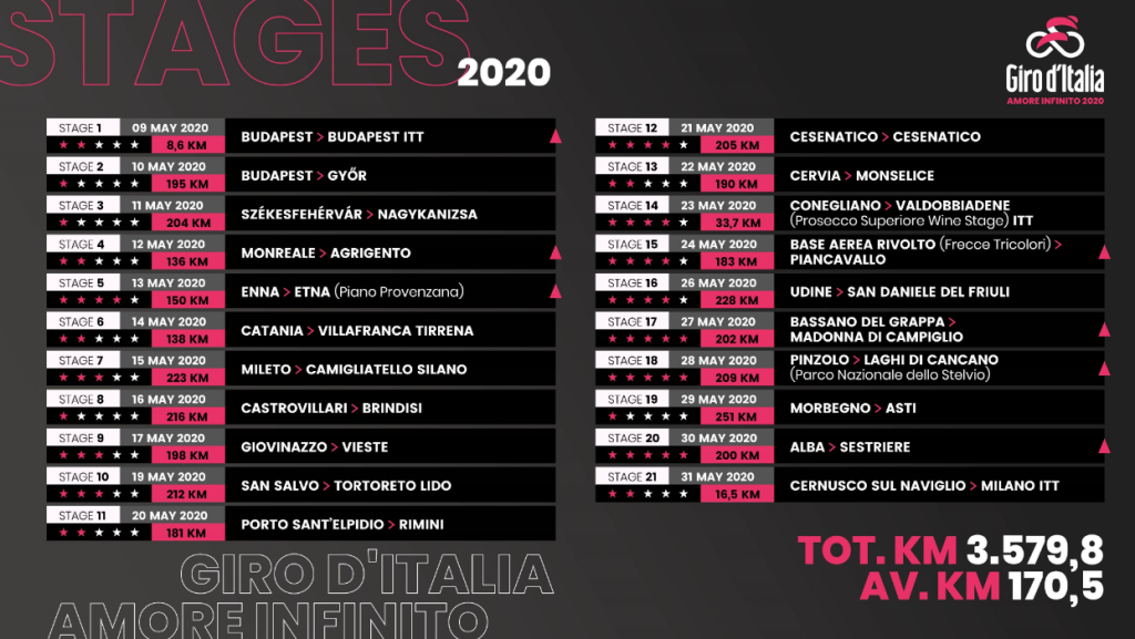 Dal 9 al 31 maggio 2020. Tre cronometro individuali (per un totale di 58,8 km), 6 tappe di bassa difficoltà adatte ai velocisti, 7 di media difficoltà e 5 di alta difficoltà caratterizzeranno il percorso dell’edizione n° 103 del Giro d’Italia 2020. Saranno 7 gli arrivi in salita, compresa la cronometro iniziale di Budapest. Frazione conclusiva, con una prova contro il tempo, da Cernusco sul Naviglio a Milano che per la 78ª volta ospiterà la tappa conclusiva. E Peter Sagan, dopo i rumors dei giorni scorsi, ha confermato che ci sarà, per la prima volta.