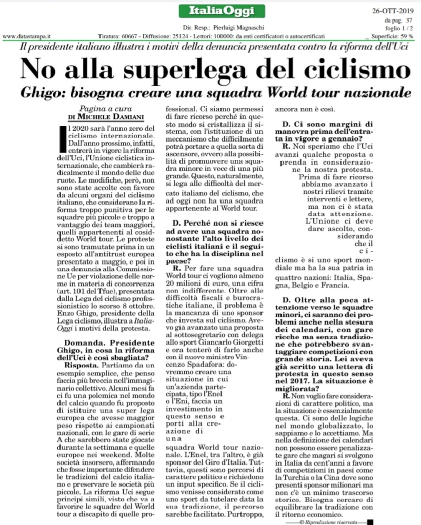 Il 2020 sarà l’anno zero del ciclismo internazionale. Dall’anno prossimo entrerà in vigore la riforma dell’Uci e nella seguente intervista Enzo Ghigo, presidente della Lega del Ciclismo Professionistico, illustra (a ItaliaOggi) i motivi della protesta che hanno condotto, di recente, alla denuncia dell’UCI alla Commissione Europea per violazione delle norme in materia di concorrenza (art. 101 del Tfue). Qui la versione integrale: