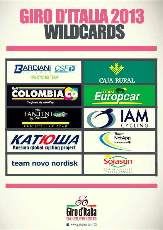 Giro Wild CardsUn twitter per aiutare la scelta delle 3 squadre da invitare al Giro 2013 tramite Wild Card. E’ l’idea lanciata da RCS che su @giroditalia chiede di esprimere il proprio giudizio tra le 10 candidate (9 +la russa Katusha in attesa del verdetto del TAS): le italiane Vini Fantini, Bardiani-CSF e Colombia-Coldeportes, la tedesca NetApp – Endura, la svizzera IAM Cycling, le francesi Europcar e Sojasun, la spagnola Caja Rural,  la statunitense Team Novo Nordisk.