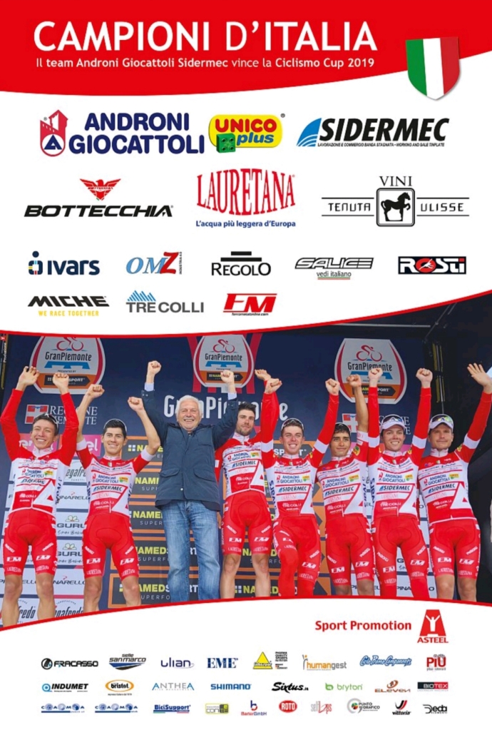 Per il terzo anno di fila, l’Androni Giocattoli-Sidermec si è piazzata davanti a tutti, confermandosi campione d’Italia. La formazione di Gianni Savio, dopo le 19 prove previste, ha conquistato la classifica a squadre della Ciclismo Cup 2019, chiudendo con 29 punti di vantaggio sulla Neri Sottoli-Selle Italia-KTM. Queste le parole di Savio: “Siamo orgogliosi di aver conquistato il titolo per il terzo anno consecutivo. Riteniamo che anche questa vittoria confermi la validità del progetto giovani, con il quale abbiamo scoperto e lanciato tra i professionisti vari talenti, primo fra tutti il recente vincitore del Tour de France Egan Bernal. Il progetto continua e per il prossimo anno abbiamo allestito una squadra nuovamente competitiva”.