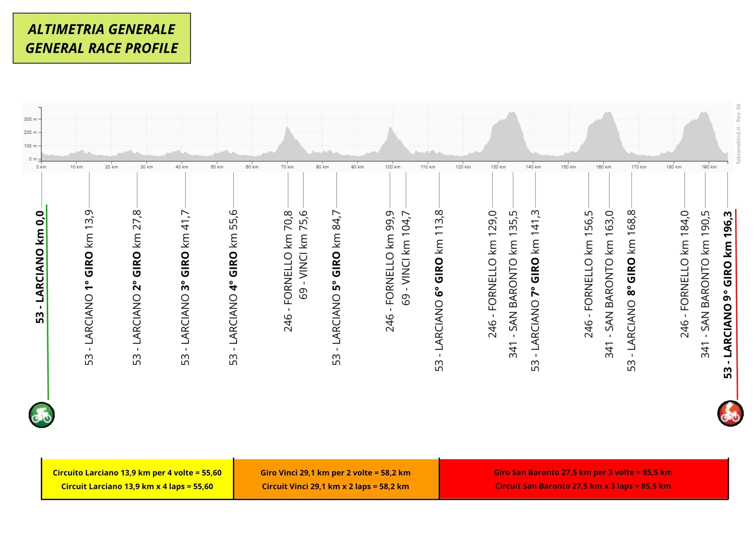 196 i km in programma con partenza e arrivo a Larciano. Dopo un inizio “soft”, con un circuito per lo più pianeggante da ripetere quattro volte, la corsa entrerà nel vivo con il primo dei cinque giri che vedono come punto focale lo strappo del Fornello, poco più di 2 km nei quali si toccano pendenze superiori al 15%. Nei primi due giri la corsa svolterà a destra, in direzione Vinci, mentre negli ultimi tre giri, dopo il Fornello, i corridori vireranno verso sinistra in direzione San Baronto che sarà scalato nel suo versante più facile ma che potrebbe rimanere indigesto per coloro che sono rimasti attardati in precedenza. La discesa finale, molto tecnica, è il preludio del gran finale verso Larciano.
