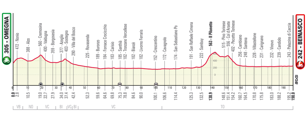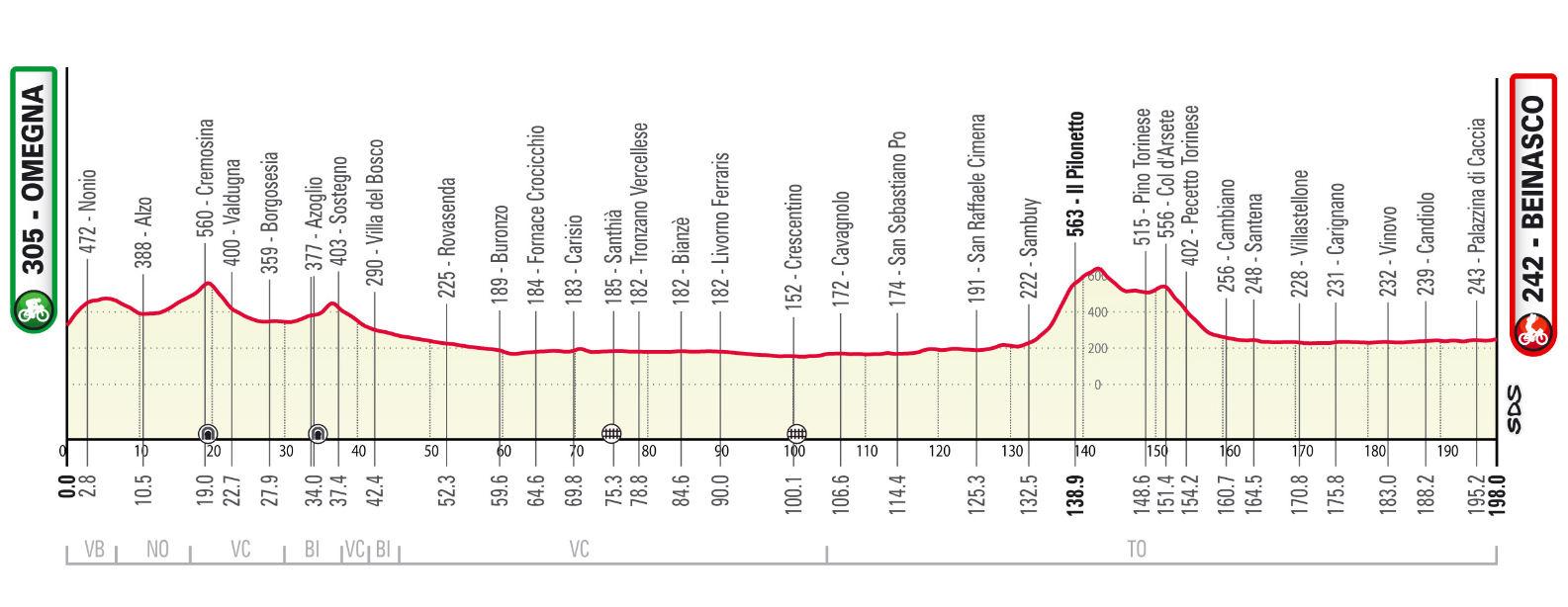Sarà un Gran Piemonte – edizione 106 – aperto a molte soluzioni quello che si svolgerà giovedì 6 ottobre con partenza da Omegna e arrivo a Beinasco dopo 198 chilometri. Partenza dal lago di Orta in leggera salita per portarsi attraverso la Cremosina a Borgosesia. Inizia l’attraversamento della pianura padana settentrionale con lunghe strade piatte e rettilinee. Dopo circa 130 km si giunge alle pendici della Collina di Superga di cui si scala il versante “Pilonetto” con pendenze che raggiungono la doppia cifra in prossimità di Rivodora. Discesa su Pino Torinese e breve salita verso l’Eremo per svoltare su Pecetto Torinese e raggiungere Cambiano dove inizia l’ultimo settore piatto della gara.