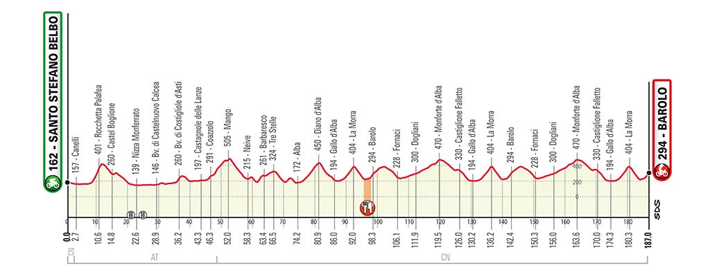 Un tracciato impegnativo tra le splendide colline delle Langhe è il disegno che, Rcs Sport in collaborazione con la Regione Piemonte, hanno voluto dare all’edizione 104 del Gran Piemonte in programma mercoledì 12 agosto con partenza da Santo Stefano Belbo e arrivo a Barolo dopo 187 chilometri. Percorso molto impegnativo all’interno delle Langhe a cavallo fra le province di Asti e Cuneo, con un circuito finale di circa 44 km da percorre due volte in mezzo ai vigneti della zona di Alba. Si affronta una lunga serie di salite e discese con pochissime possibilità di riposo. Nella parte di avvicinamento al primo passaggio si scalano Rocchetta Palafea, Mango, Barbaresco e Diano d’Alba. Dopo Grinzane Cavour si entra nel circuito che presenta le salite di La Morra, Barolo, e Monforte d’Alba. Salita finale comune all’arrivo della cronometro del Giro d’Italia 2014 Barbaresco-Barolo, con linea di arrivo diversa, con un breve tratto di ulteriore salita.