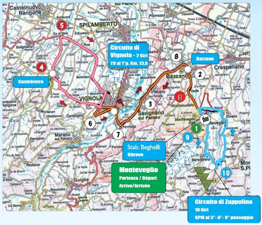 Domenica 6 ottobre si corre il Gp Beghelli, valido come sedicesima prova della Ciclismo Cup 2019. Si partirà dalle unità produttive della Beghelli a Valsamoggia e dopo un breve tratto di trasferimento verso il centro città ci sarà il via ufficiale dei 199.3 chilometri di corsa. I corridori si contenderanno il traguardo volante di Vignola dopo 3 chilometri per poi dirigersi subito verso il circuito di un chilometro del Gessiere che i corridori percorreranno per due volte toccando le località di Castelvetro e Ca di Sola. Al termine di questo circuito la corsa farà ritorno a Valsamoggia, dove comincerà il circuito dello Zappolino, un’erta che al terzo, al sesto e al nono passaggio varrà anche come GPM, mentre sarà traguardo volante al secondo, al quinto e all’ottavo giro.