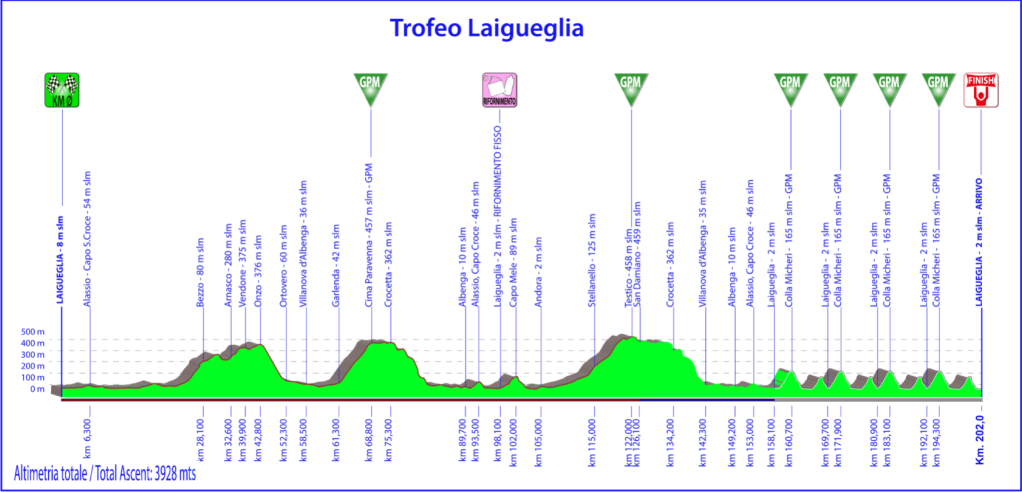 Dopo le operazioni preliminari con il foglio firma e la presentazione degli atleti in Piazza dei Pescatori e il via ufficioso da Via Roma (alle 10.50), la carovana raggiungerà le località di Albenga, Alassio e Ceriale per poi affrontare la prima asperità della giornata: quella di Onzo, preludio ad una parte di gara particolarmente interessante. Dopo aver toccato Ortovero e Villanova d’Albenga i corridori si dirigeranno verso il primo Gran Premio della Montagna della giornata, quello di Cima Paravenna, salita storica del Trofeo. Dopo un primo passaggio in zona traguardo, a circa metà gara, si entrerà nel vivo con il Capo Mele e il Testico per poi entrare nel circuito conclusivo di 12.6 chilometri con le asperità di Capo Mele e Colla Micheri che sarà affrontato come lo scorso anno per quattro volte prima dell’arrivo, dopo 203 chilometri di gara.