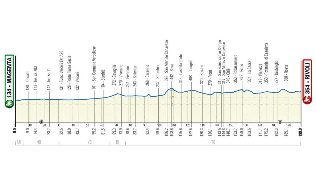 Il Canavese si presenta con piccoli saliscendi che proseguono e Nord di Torino nella zona del Parco della Mandria. All’imbocco della Val di Susa la strada torna sostanzialmente pianeggiante fino all’arrivo. Si incontrano, negli abitati attraversati, i consueti ostacoli cittadini come rotatorie, spartitraffico e passaggi rialzati. Ultimi 10 km praticamente pianeggianti fino all’arrivo di Rivoli. Ultimi cinque km pianeggianti su strade cittadine molto ampie con la presenza di ampie rotatorie. Ultima curva a 400m dall’arrivo. Rettilineo finale di 400 metri.