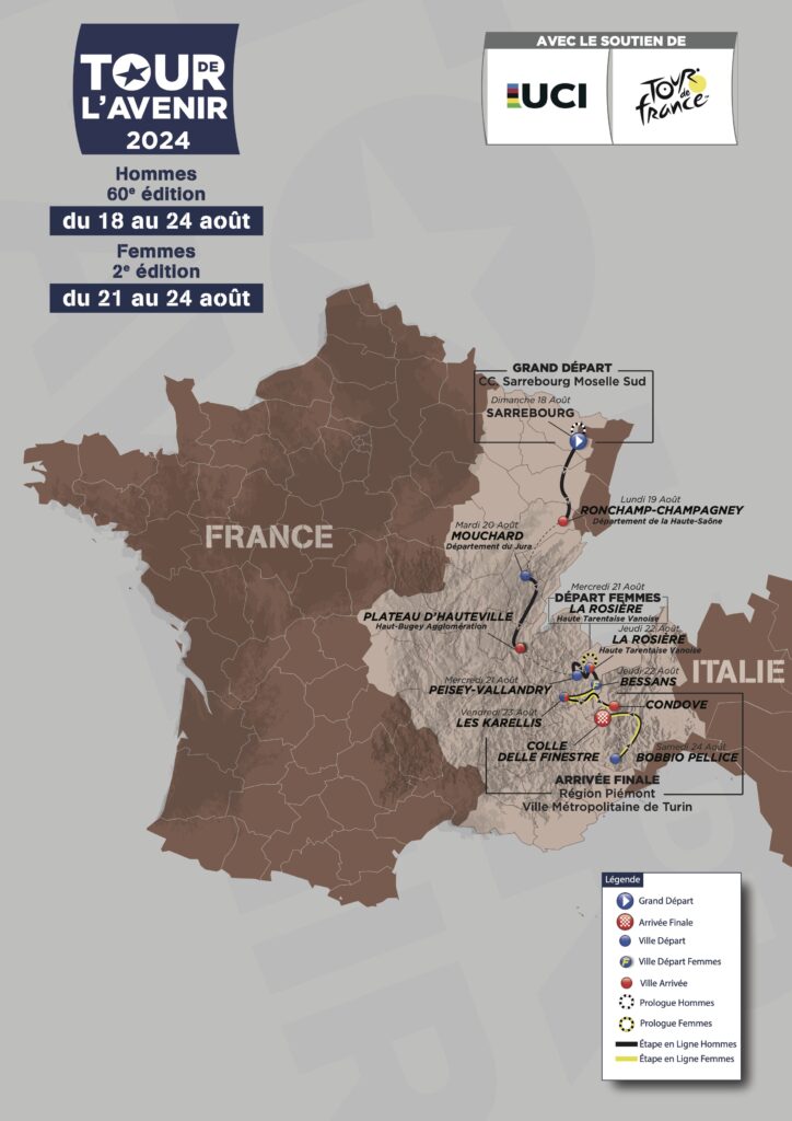 Il Tour de l’Avenir Hommes è in programma dal 18 al 24 agosto 2024; il Tour de l’Avenir Femmes si svolgerà in contemporanea negli ultimi quattro giorni, dal 21 al 24 agosto, ricalcando il percorso maschile nelle ultime tre tappe dopo il prologo di La Rosière.