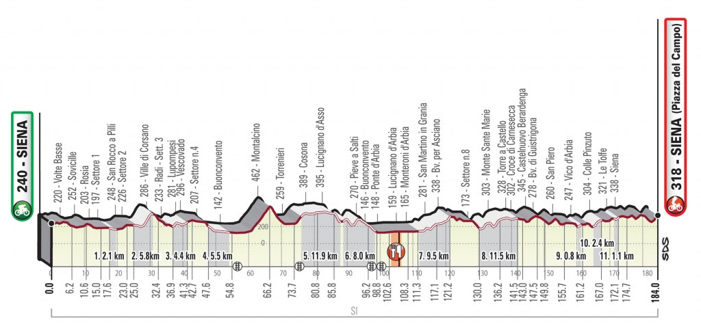Gli ultimi km si snodano per la prima parte all’esterno dell’abitato di Siena su strade larghe e lunghi rettifili collegati tra loro da ampie curve, prima in discesa e poi in leggera salita fino ai 2 km dall’arrivo dove viene imboccata la via Esterna di Fontebranda con pendenze fino al 9%. A 900 m dall’arrivo si supera la Porta di Fontebranda e inizia la pavimentazione lastricata. La pendenza supera il 10% fino a raggiungere attorno ai 500 m dall’arrivo, in via Santa Caterina, punte del 16%. Segue una svolta decisa a destra nella via delle Terme e l’immissione in via Banchi di Sotto. Dai 300 m la strada è sempre in leggera discesa. Ai 150 m svolta a destra in via Rinaldini. Ai 70 m si entra nel Campo, ultimi 30 in discesa al 7%, traguardo pianeggiante.