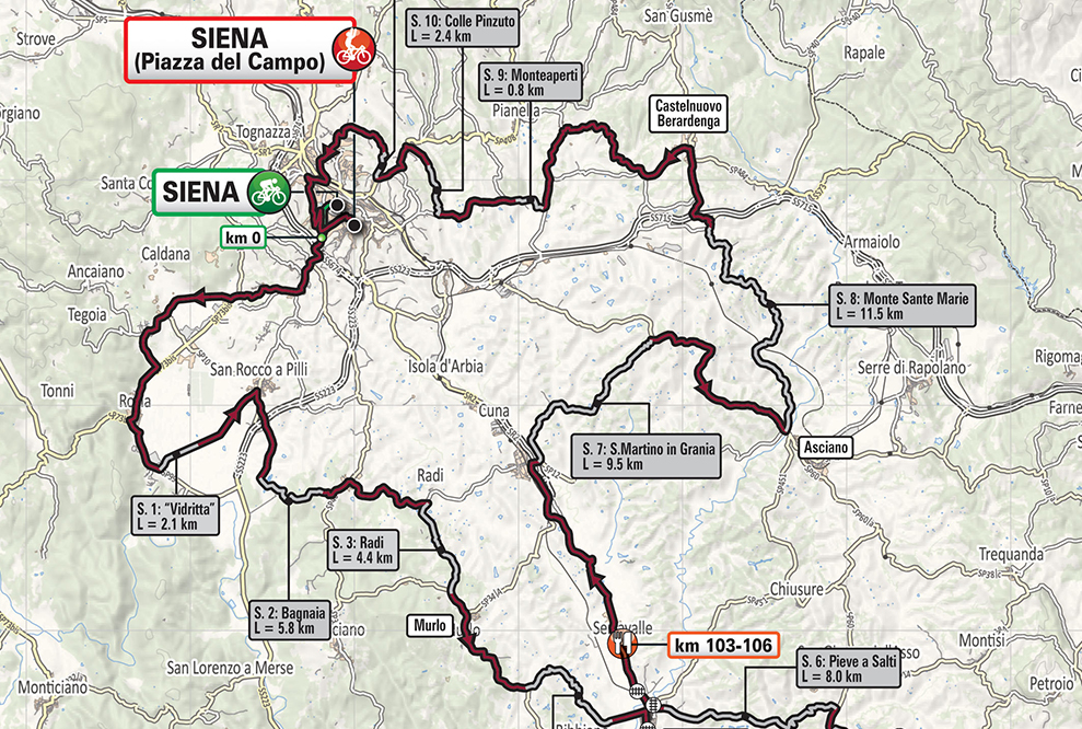 Percorso molto mosso e ondulato sia sul piano planimetrico che altimetrico, privo di lunghe salite, ma costellato di strappi più o meno ripidi specie su sterrato. Sono presenti circa 63 km di strade sterrate divise in 11 settori con fondo ben tenuto, ben battuto, privo di incursioni erbose e con scarso brecciolino sulla superficie. Partenza da Siena (zona Stadio/Fortezza Medicea), primi chilometri ondulati su asfalto per raggiungere, al km 18, il 1° settore sterrato (2.1 km) perfettamente rettilineo sempre in leggerissima discesa. Pochi chilometri separano dal 2° settore (5.8 km), prima vera asperità della corsa con un breve tratto in leggera discesa e un lungo tratto in salita, a volte con pendenze attorno e oltre il 10%. Si raggiunge quindi Radi dove si incontra il 3° settore (4.4 km, si tratta della seconda parte del primo sterrato del percorso delle origini) e subito dopo il 4° settore “La Piana” (5.5 km, presente sin dalla prima edizione, l’ex-secondo settore del percorso in origine) altimetricamente meno impegnativo che porta a Buonconvento. Pochi chilometri dopo si affronta la salita di Montalcino, la seconda asperità di giornata (4 km, 5%).