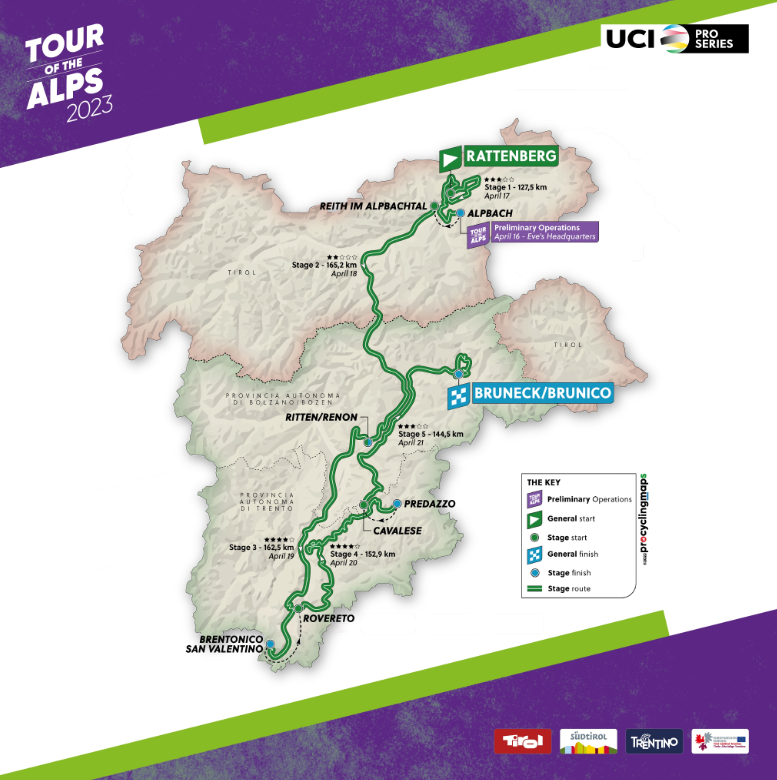 Martedì 18 arriverà la tappa più lunga, con partenza da Reith im Alpbachtal e arrivo a Renon, in Alto Adige, all’interno della pista di pattinaggio di velocità della Reith Arena, che diventerà per un giorno un velodromo. La corsa attraverserà il confine italiano al passo del Brennero, prima di affrontare negli ultimi chilometri le salite di Barbiano e Monte di Mezzo, adatte a scalatori esplosivi.
